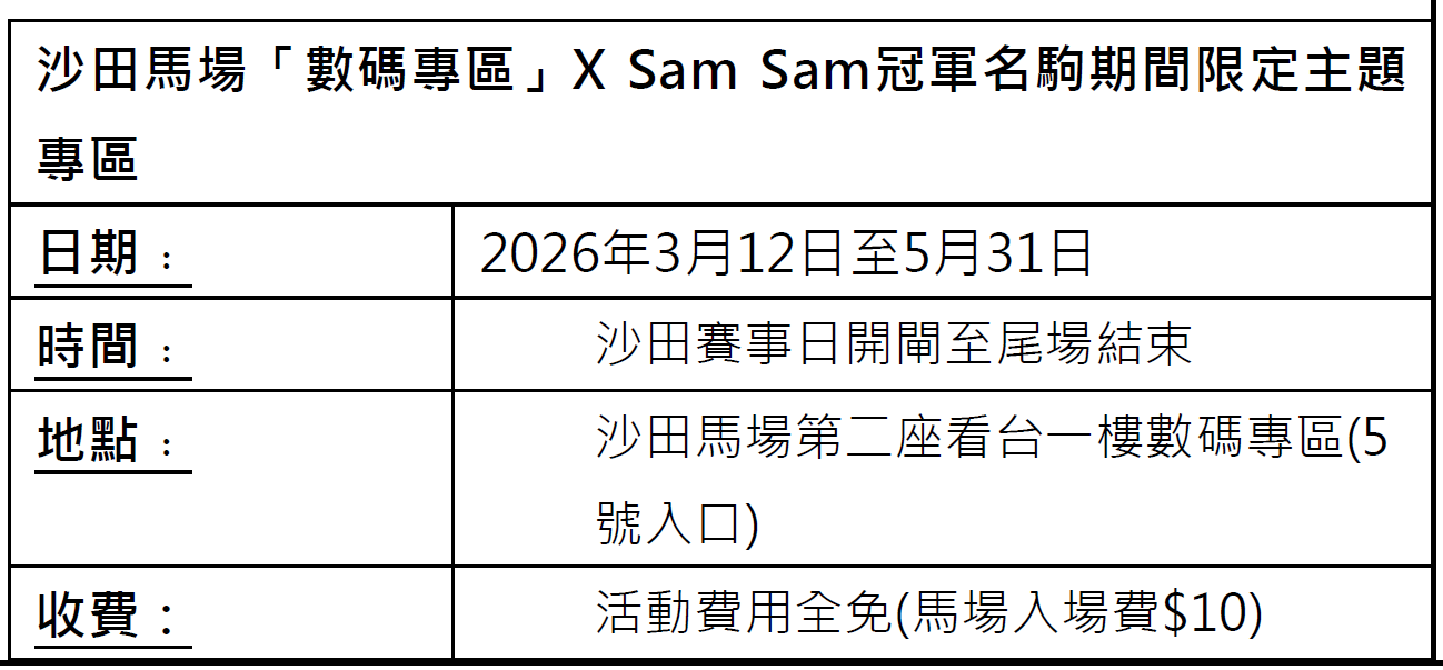 香港賽馬會「數碼專區」首度聯乘本地人氣潮玩IP Sam Sam,即日起至5月31日在沙田馬場舉辦一系列活動,開設Sam Sam馬場期間限定店,現場更有多個打卡位,齊集影相、消閒購物及娛樂互動於一身的多元嶄新體驗。淘氣男孩Sam Sam將穿上八大冠軍名駒的馬主綵衣變身型格騎師,登陸「數碼專區」。1.5米高模型Sam Sam將率領兩大馬王,分別是剛締造18連勝香港賽馬紀錄的「嘉應高昇」及四度贏得浪琴香港盃的「浪漫勇士」,於4月在「數碼專區」入口迎接入場人士。「數碼專區」內亦有「Sam Sam101」教室,Sam Sam與八大冠軍名駒將輪流成為每周活動主題,介紹Sam Sam個性與特質之外,更提供馬匹及馬場冷知識。最後,別忘記在現場的互動裝置下載Sam Sam騎師主題通訊軟件貼圖,並即時加入自己的頭像,炮製馬年祝福,及在自拍區製作與Sam Sam騎師拉頭馬紀念照。
