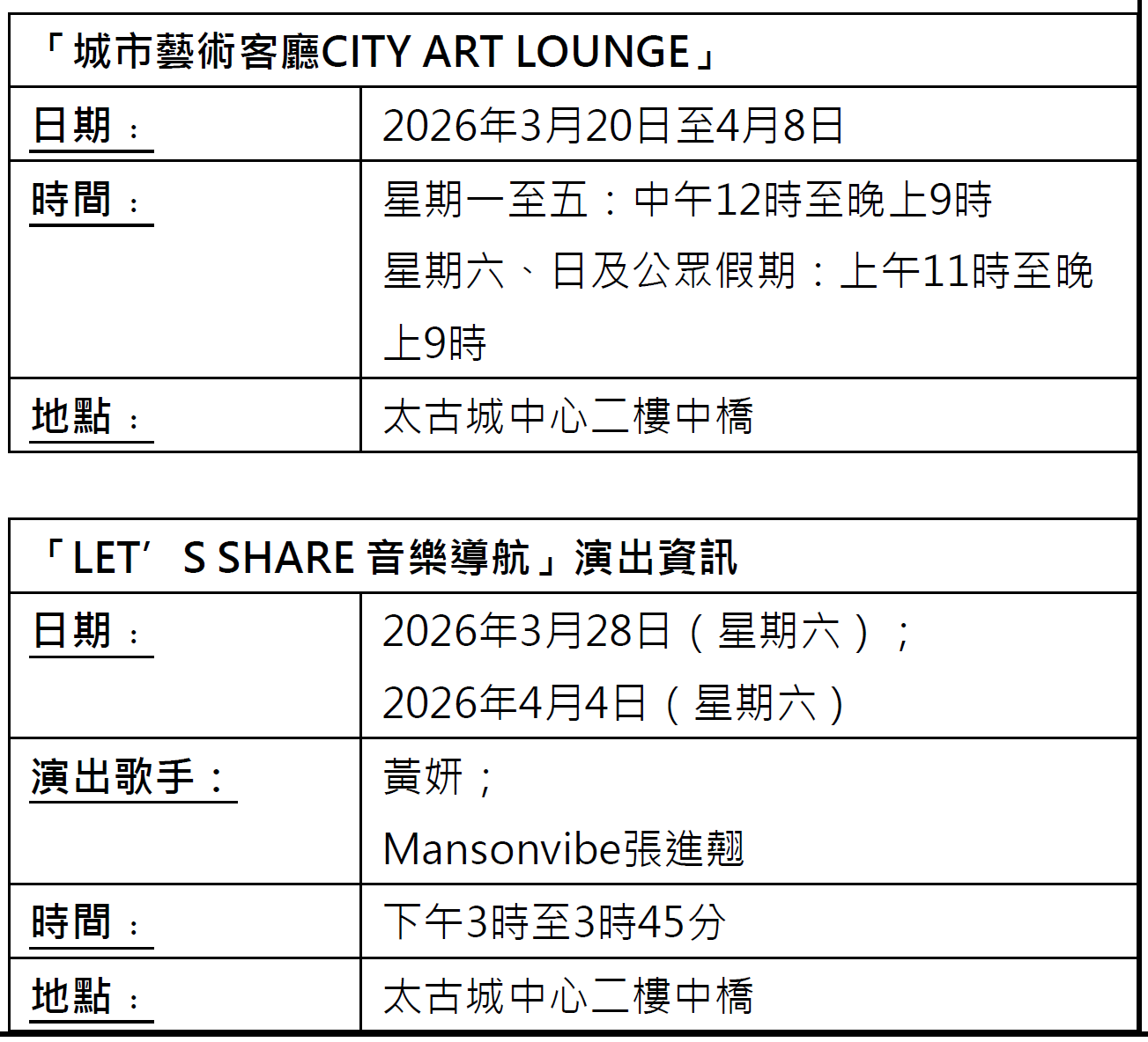 今個「藝術三月」,太古城中心即日至4月8日隆重呈獻「城市藝術客廳CITY ART LOUNGE」,以「IN ART WE SHARE」為主題,透過曾亮相於2025年巴塞爾藝術展香港展會的英國著名藝術家Liam Gillick大型裝置《Perpetual Discussion Platforms》為核心,延伸出三大互聯空間:「LET’S SEE歡朋滿座」公共藝術交流平台、「LET’S INSPIRE靈感站台」多領域藝術文本展現及「LET’S SHARE音樂導航」現場音樂體驗,建構流動的人文互動交流。