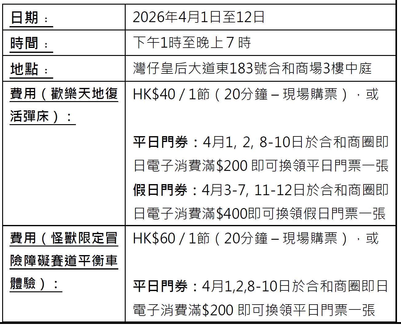 今個復活節,灣仔合和商場邀請小朋友前來散發無限活力!灣仔地標合和商場聯同平衡車著名品牌、全球銷售量逾400萬架次的STRIDER HK與去年最大旗艦店登陸合和商場的歡樂天地攜手呈獻「怪獸復活平衡車X彈床天地」主題活動,兩大玩樂區域「怪獸限定冒險障礙賽道」與「歡樂天地復活彈床」震撼升級回歸並首度同時開放,加入四大關卡以及2.5米高吹氣復活怪獸,共迎歡樂與刺激兼備的節日時光。小朋友們更可以報名參與「怪獸限定冒險障礙賽」,穿越四大關卡,爭取成為極速車手,成為全場耀眼新星!「2026怪獸復活平衡車障礙賽」與「2026平衡車室內飆車賽」兩大賽事歡迎小朋友與家長一同挑戰,更有歡樂天地吉祥物主題吹氣森林彈床,挑戰巨型滑梯解鎖勇氣膽量。