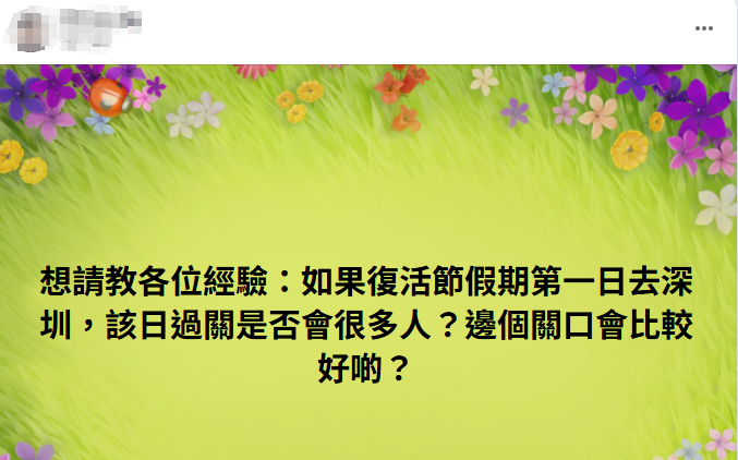 有網友昨日(3月31日)在「深圳大灣區好去處開心share」Facebook群組發布帖文,向其他網友請教經驗,「如果復活節假期第一日去深圳,該日過關是否會很多人?邊個關口會比較好啲?」帖文一出引來不少網民回應分享經驗,一一盤點各個口岸的人流特點,並列出最佳過關時間及通關貼士。