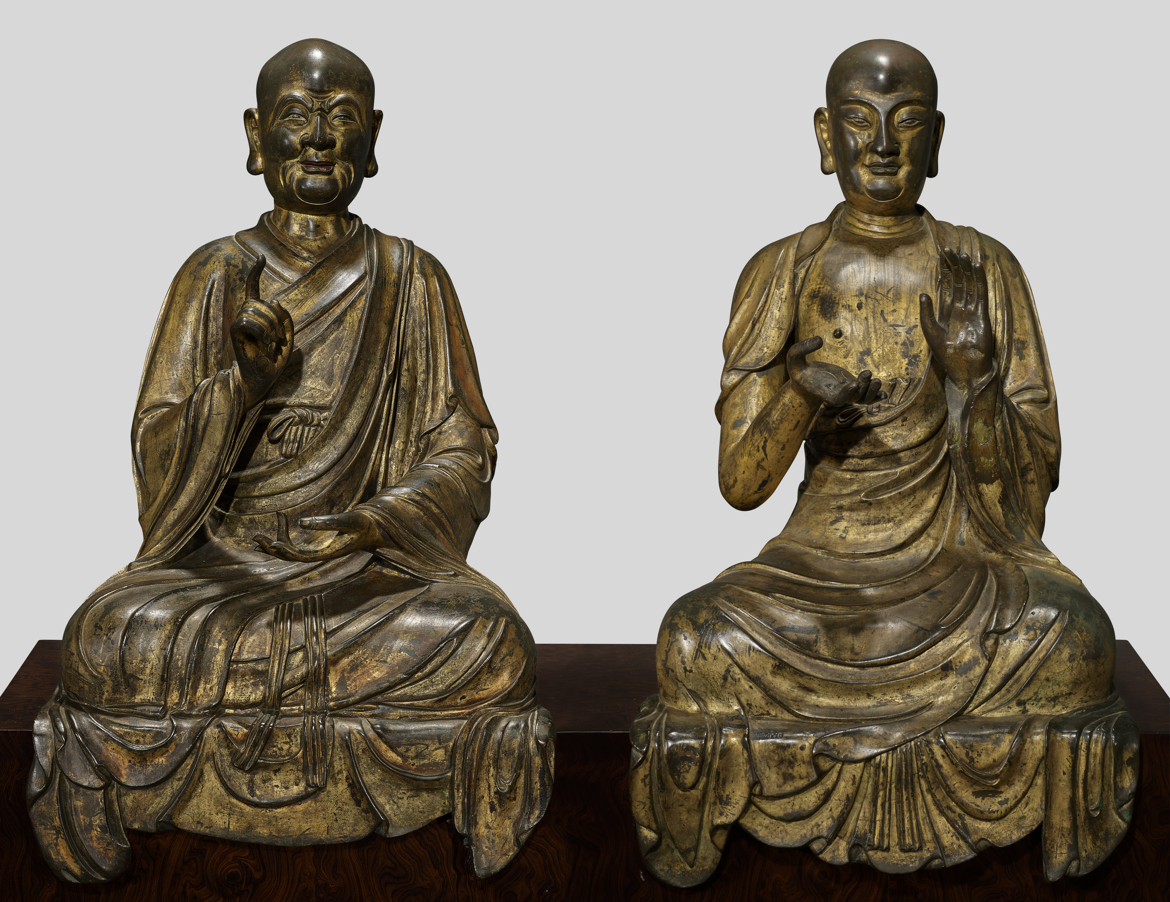 領拍之作為一對極為珍罕的明初鎏金銅羅漢像。這對羅漢像鑄造精美,刻畫中國和印度僧侶的形象。羅漢像體現宋代自然寫實風格過渡至十五世紀初精緻御製樣式的重要轉變階段,為有關羅漢形象演變的學術研究提供重要的參考。兩尊銅像的體型碩大,工藝精湛,應為大型佛寺委託鑄造,彰顯作品在明初佛教雕塑中的重要地位。