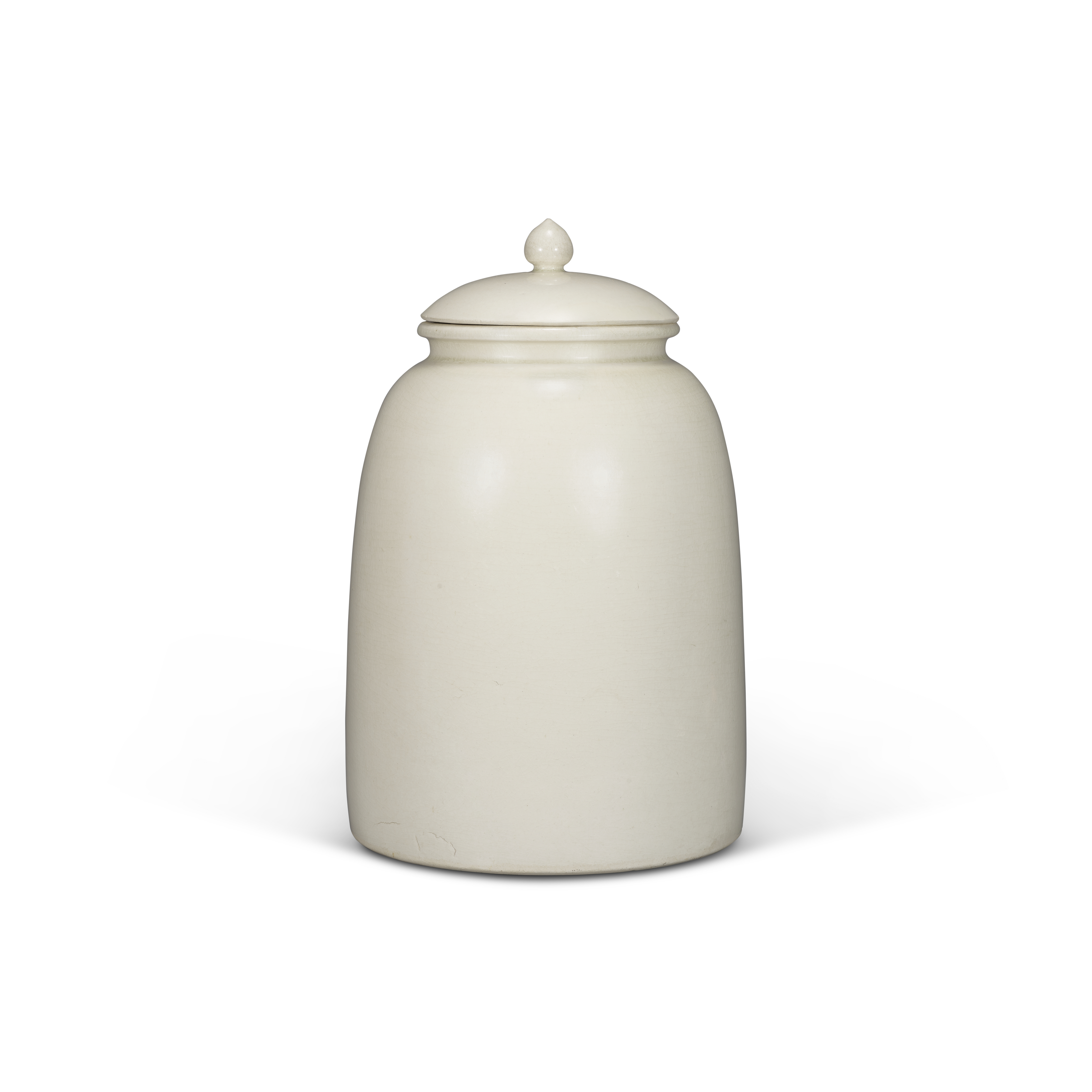 隋代白釉罐帶蓋見證中國陶瓷發展史的重要成就,屬最早一批高溫燒製之白胎透明釉炻器。這項技術於六世紀更臻成熟,方能成就此類白釉器。此品器型碩大規整,釉色瑩潤,足證隋代製瓷工藝之飛躍發展。