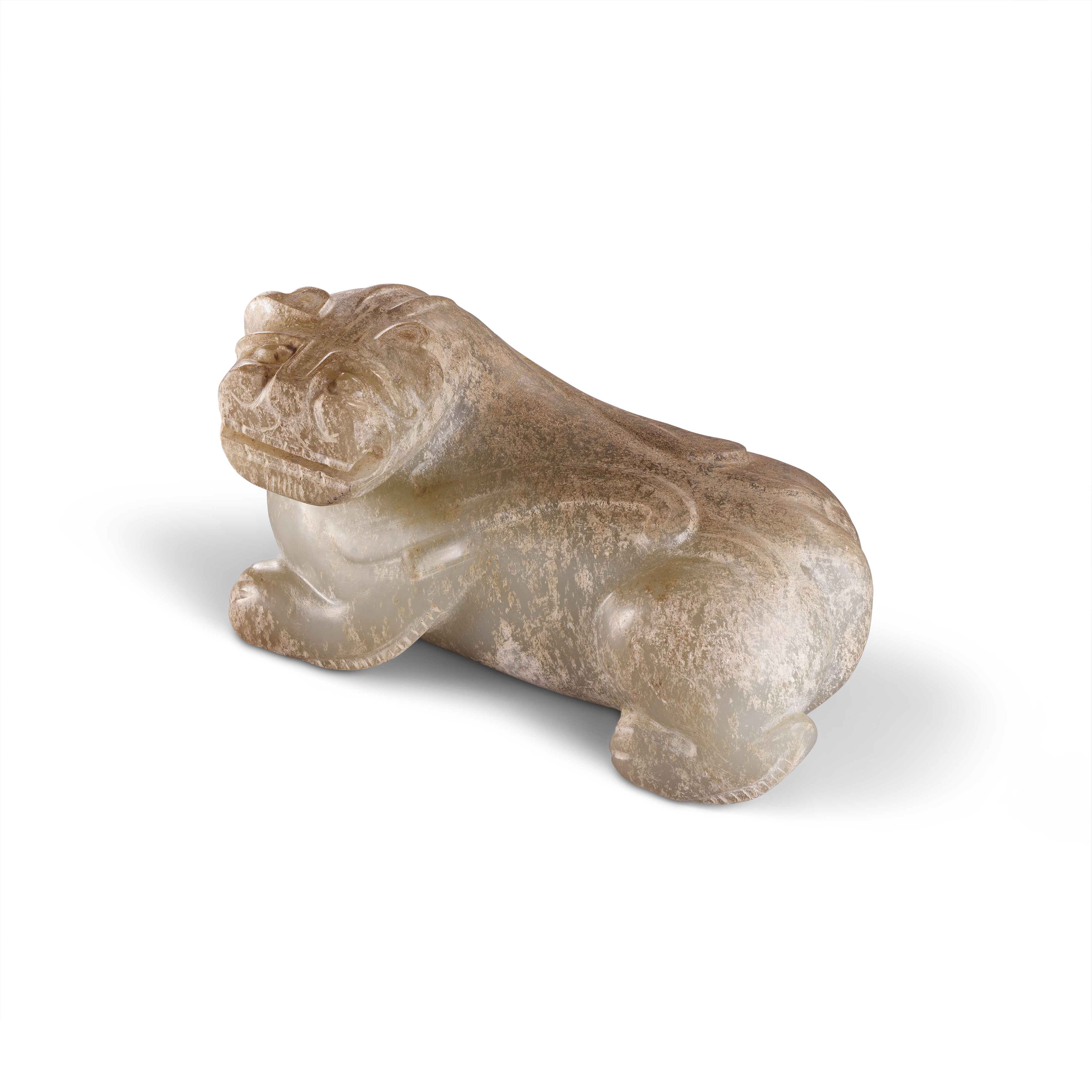 東漢晚期玉虎雕工精巧,作伏臥之姿,神態生動。虎為四靈之一,方位屬西,寓剛猛護佑之意。玉虎結合西方白虎的威嚴氣勢與辟邪的驅邪護佑之力,首生雙角,身側帶翼,體魄雄健。虎目圓睜凝視,張口露齒,刻畫入微,展現漢代無出其右的動物玉雕工藝。目前已知的同類型器並無他例可尋,只有北京和台北大型博物館的相近藏品可資比對。