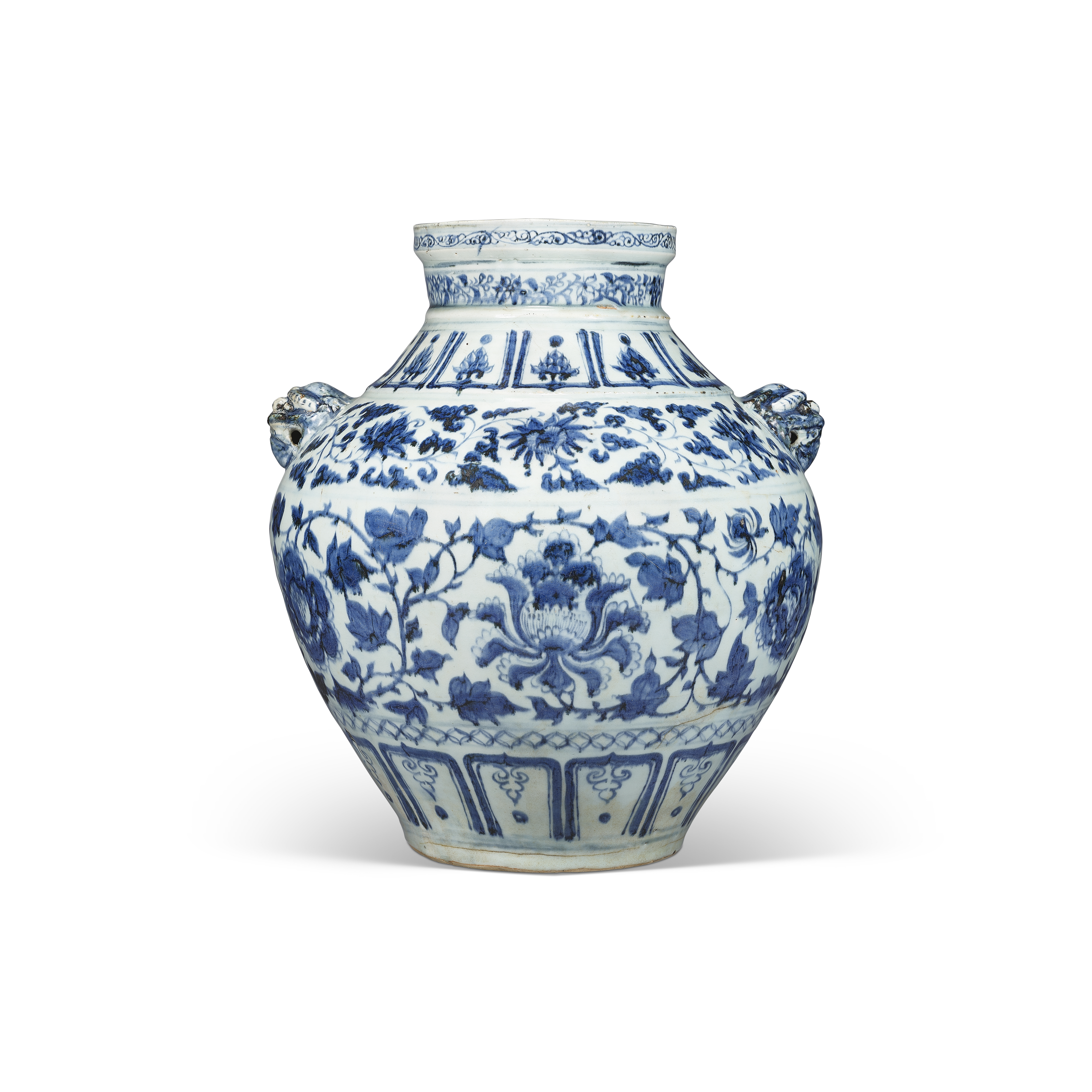 元青花牡丹紋獸耳罐器型雄厚有力,紋飾奔放灑脫,青花發色濃豔亮麗,為元代青花瓷精品。器身以青花分繪多層明代經典紋飾,例如牡丹紋、纏枝蓮紋、纏枝花卉紋和覆蓮紋。青花紋以從中東進口的蘇麻離青料仔細描繪,彰顯此罐為當時價值連城的名品。現存的類似青花牡丹紋罐甚為稀少,並藏於托普卡比博物館、上海博物館及靜觀堂。