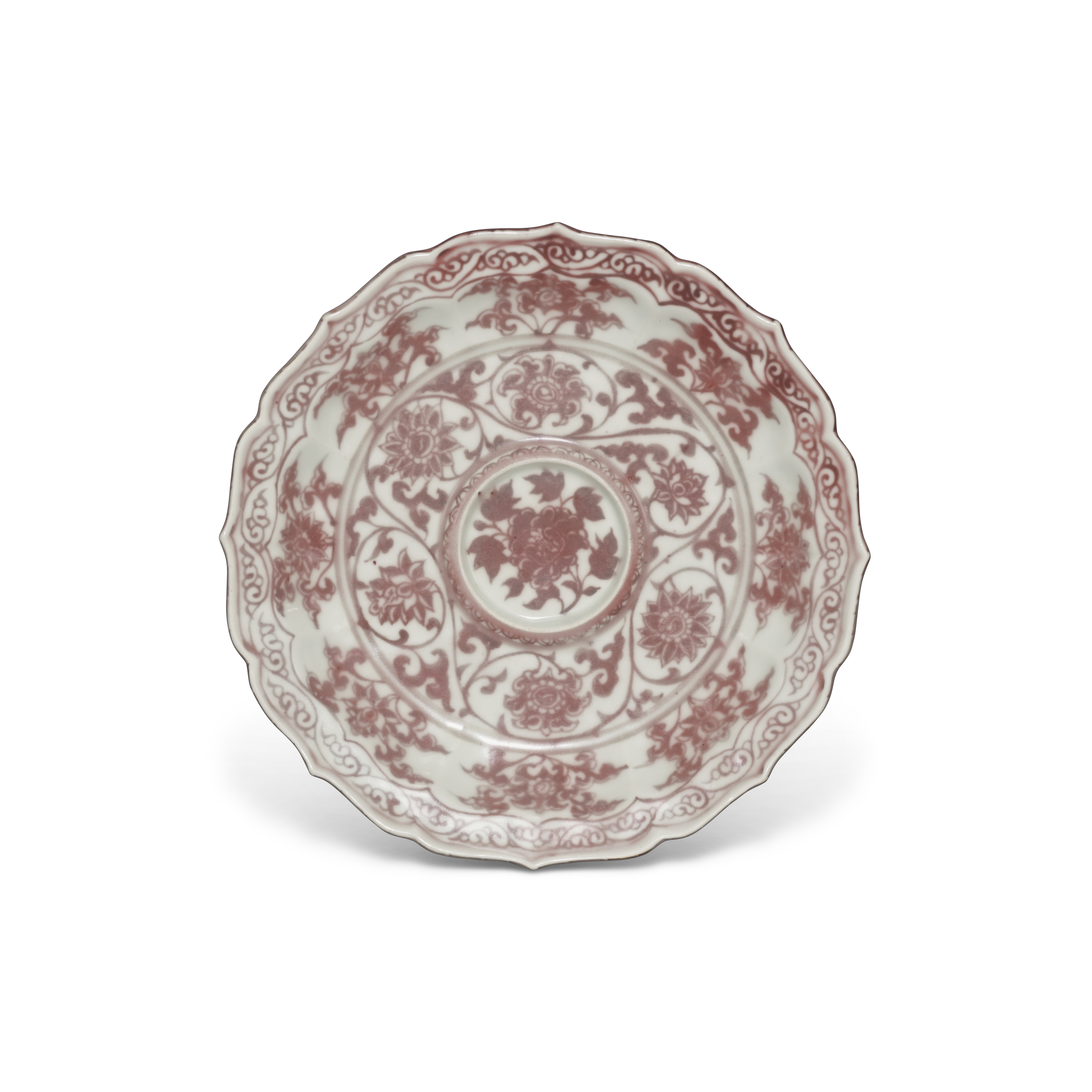 明洪武釉裏紅纏枝花卉紋菱口盞托發色鮮紅而均勻,為難得一見的傳世珍品,配以造工精緻的菱口器型,實屬明初單色釉瓷器中的典範。這類盞托常以各類纏枝花紋點綴,彰顯其於洪武御瓷中的重要性。同類作品包括上海博物館所藏的釉裏紅纏枝菊花紋菱口盞托。