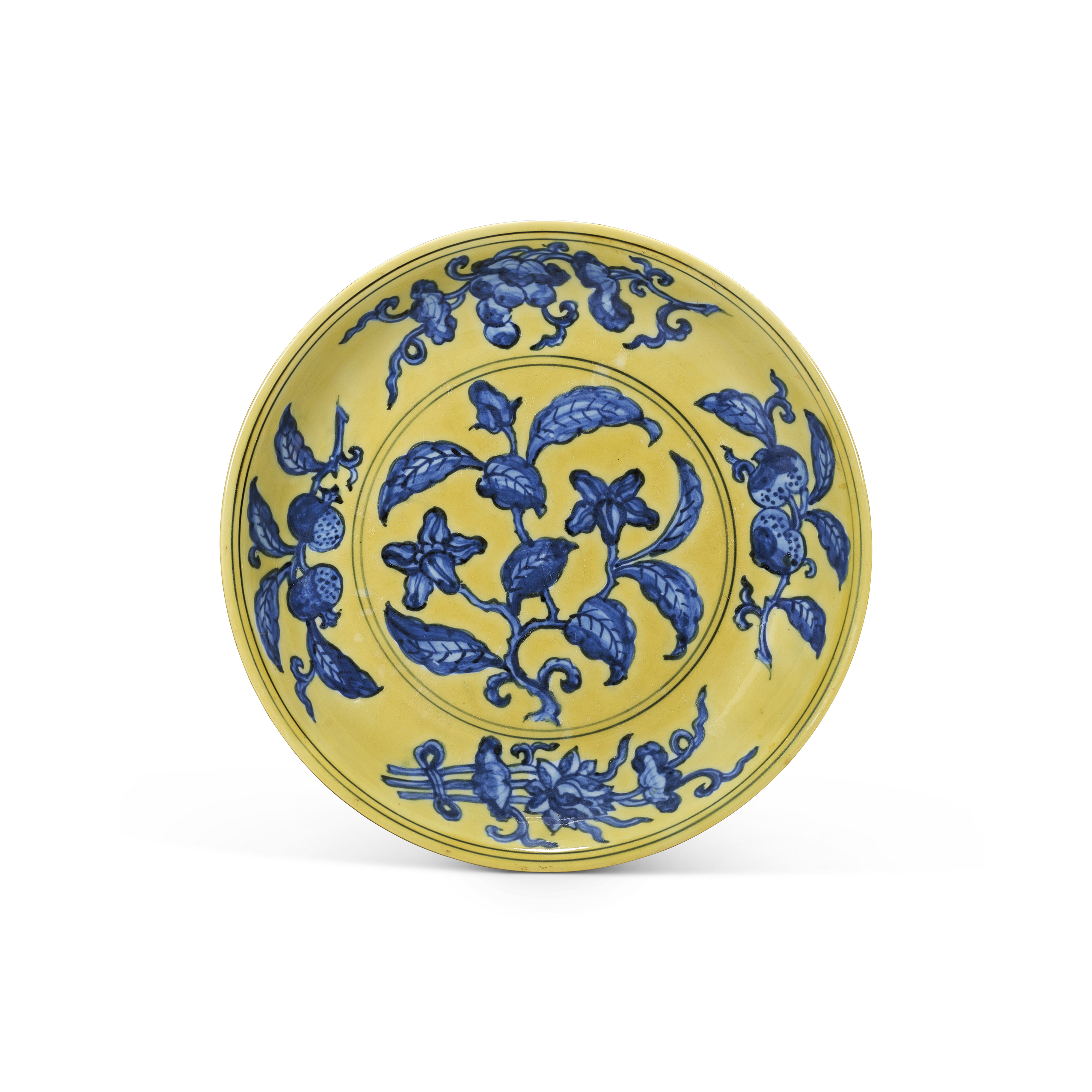 明正德 黃藏青花梔子花果紋盤雙圈六字楷書款
