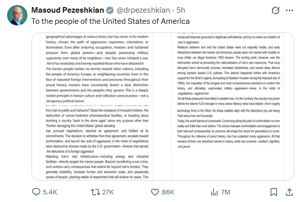 【點新聞報道】當地時間4月2日,伊朗總統佩澤希齊揚向美國人民發表公開信,指伊朗人民對其他國家沒有敵意,包括美洲、歐洲或鄰國人民;強調伊朗在現代史上從未選擇過侵略、擴張、殖民或統治的道路。