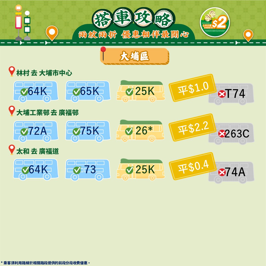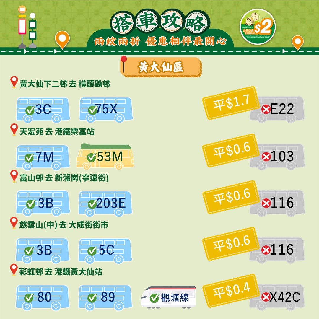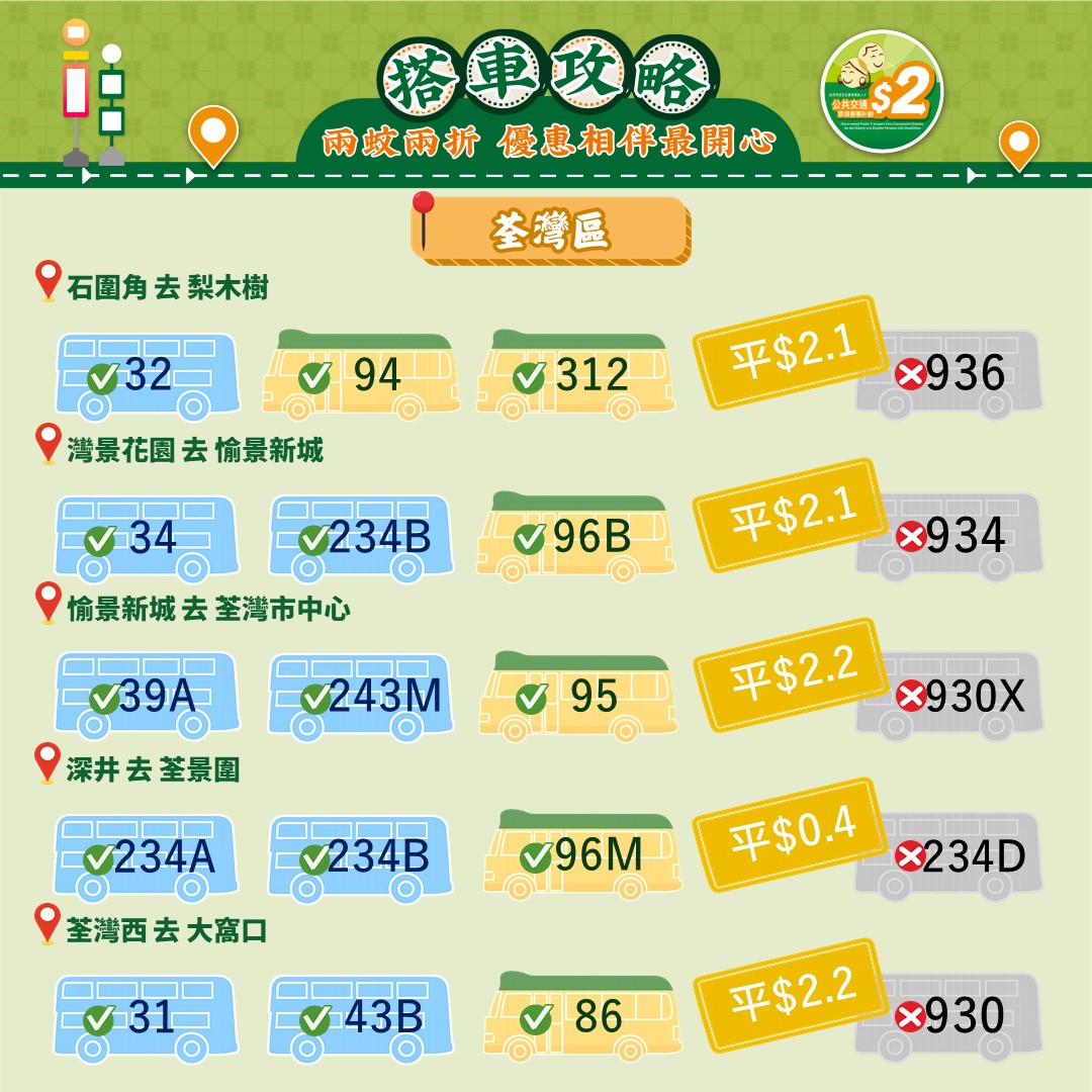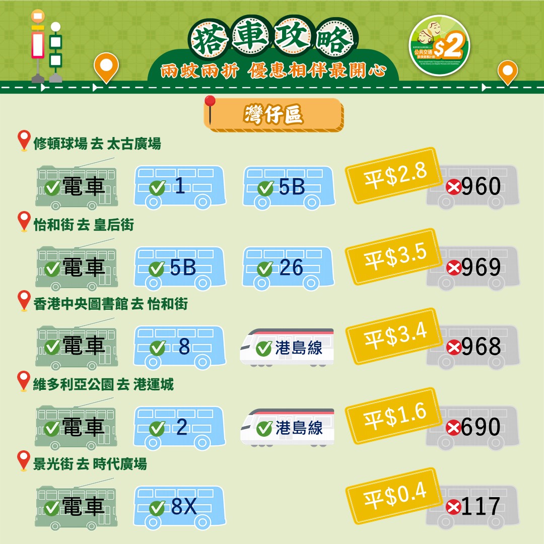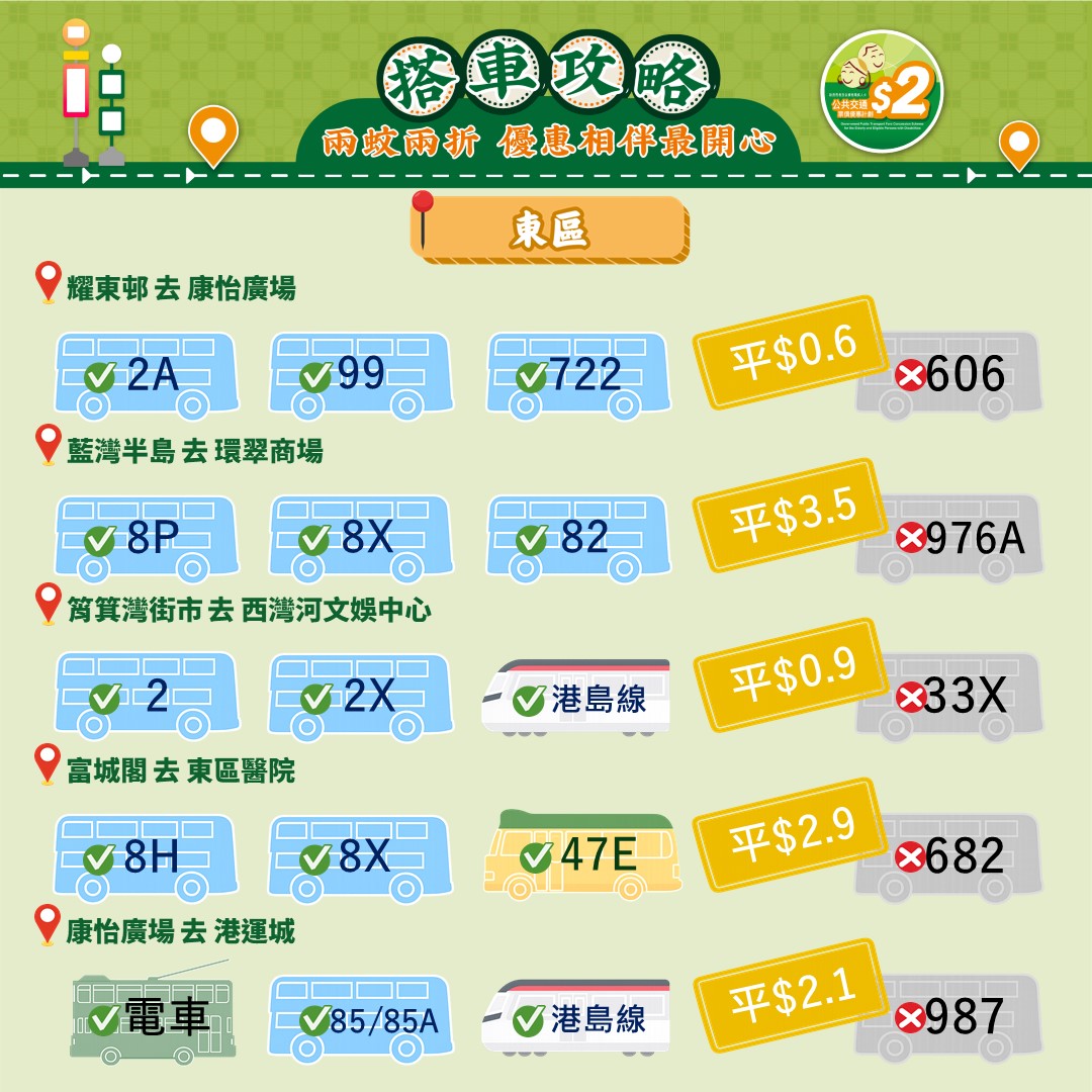 此外,運輸署還推出乘車懶人包,教受惠人士以最便宜的方法乘搭區內交通工具。其中由東涌市中心來往東涌西一程可節省5.4元。如果乘搭新大嶼山23號巴士,假日全程車資達37元,「兩蚊兩折」後需付7.4元。如果改乘34號巴士,車資僅5.1元,長者實付2元。