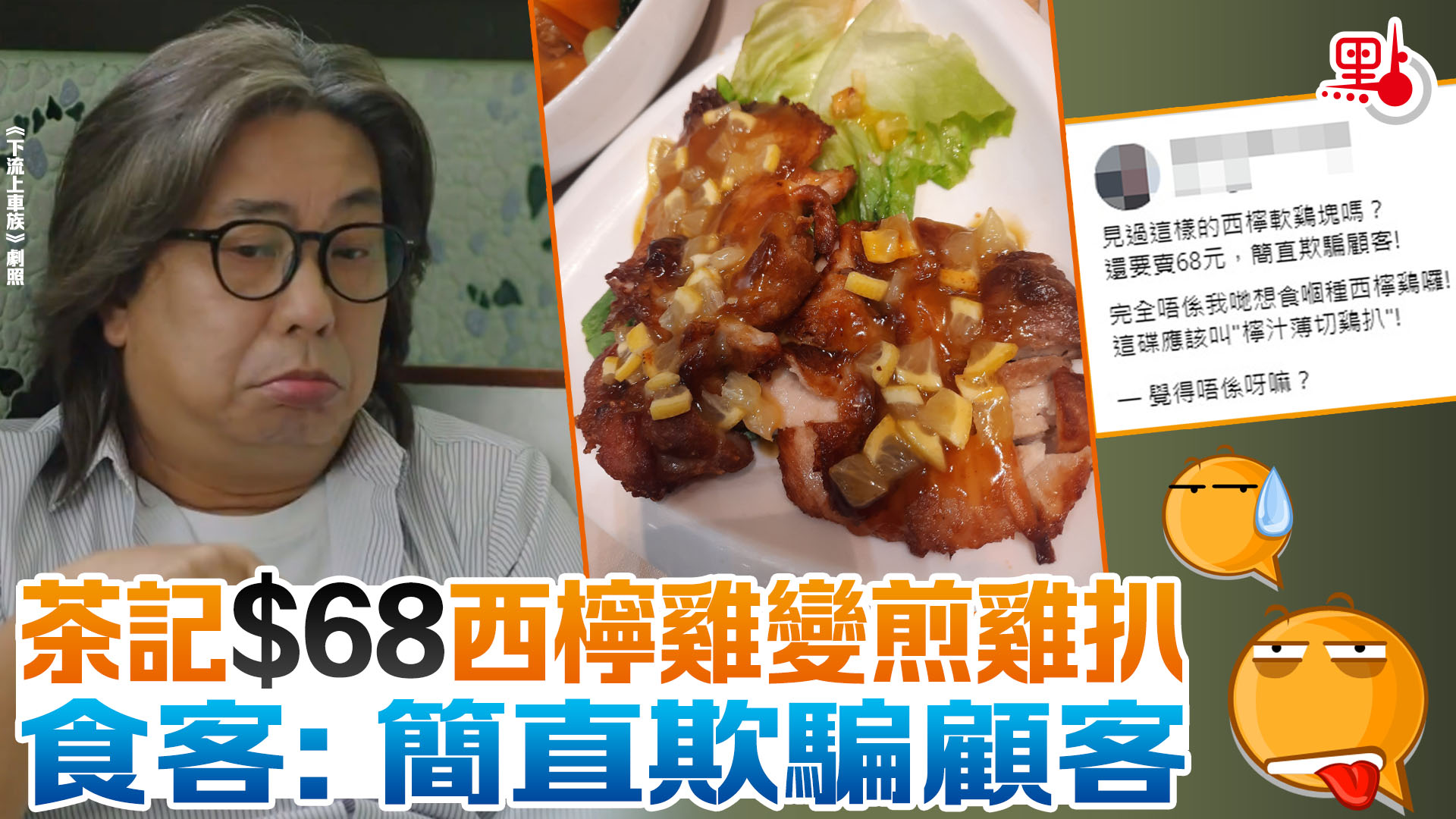 該網民在fb專頁「香港茶餐廳及美食關注組」發文公審茶餐廳,「見過這樣的西檸軟雞塊嗎?還要賣68元,簡直欺騙顧客!」從其上載的相片可見,西檸雞的檸檬汁雞塊變了雞扒,本該是淺黃色的西檸雞小菜,就變深色了幾倍!