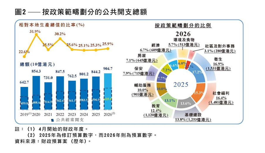【點新聞報道】財政司司長陳茂波於2月25日發表了本屆政府的第四份財政預算案。立法會秘書處(秘書處)今日(4月2日)發表有關「2026-2027年度財政預算案」的《研究簡報》。報告探討政府近期財政狀況及已落實的強化版財政整合計劃,預計本財政年度公共開支總額將進一步上升7.2%至9047億港元,當中,衞生及社會福利繼續成為最大的兩個開支範疇,基礎建設則取代教育,成為第三大開支範疇。隨着北部都會區相關項目陸續展開,未來五年基本工程開支年均約為1200億港元。