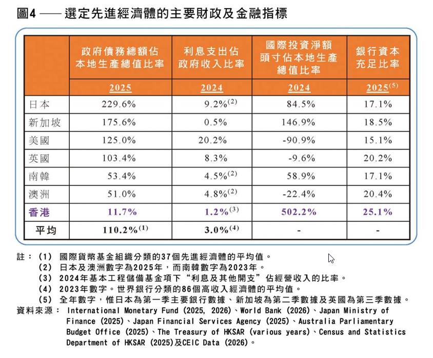 財政司司長在2026至2027財政年度的財政整合計劃中,建議從外匯基金的投資收入中轉撥1500億港元,引起廣泛討論。同時,財政司司長亦建議將發債上限由7000億港元提高至9000億港元,並提高較長期債券所佔比重。《研究簡報》指出,社會對政府債務走勢的憂慮仍然存在,其中早年發行債券的償還壓力日增,預計由2026/27至2030/31財政年度,發債所得的淨資金將減少43.3%,政府債務總額佔本地生產總值的比率亦會升至19.9%。然而,有關比率仍遠低於先進經濟體的平均水平,利息開支亦僅佔政府收入的1.2%。以一系列的金融指標衡量,香港的財政狀況依然穩健,香港的信貸實力在各主要先進經濟體中仍名列前茅。