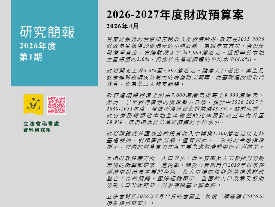 立法會將於4月22日的會議上恢復二讀辯論《2026年撥款條例草案》,議員會就該法案發言。《研究簡報》現可於立法會網頁預覽。