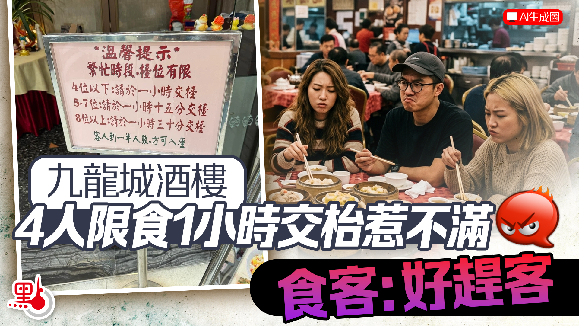 【點新聞報道】有食客近日在社交媒體發帖,稱九龍城的一間酒樓在繁忙時間設立用餐時限,4位或以下限1小時交枱,引發網民討論。