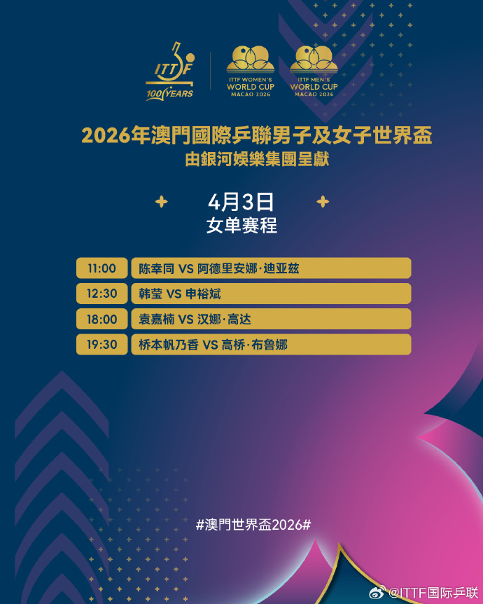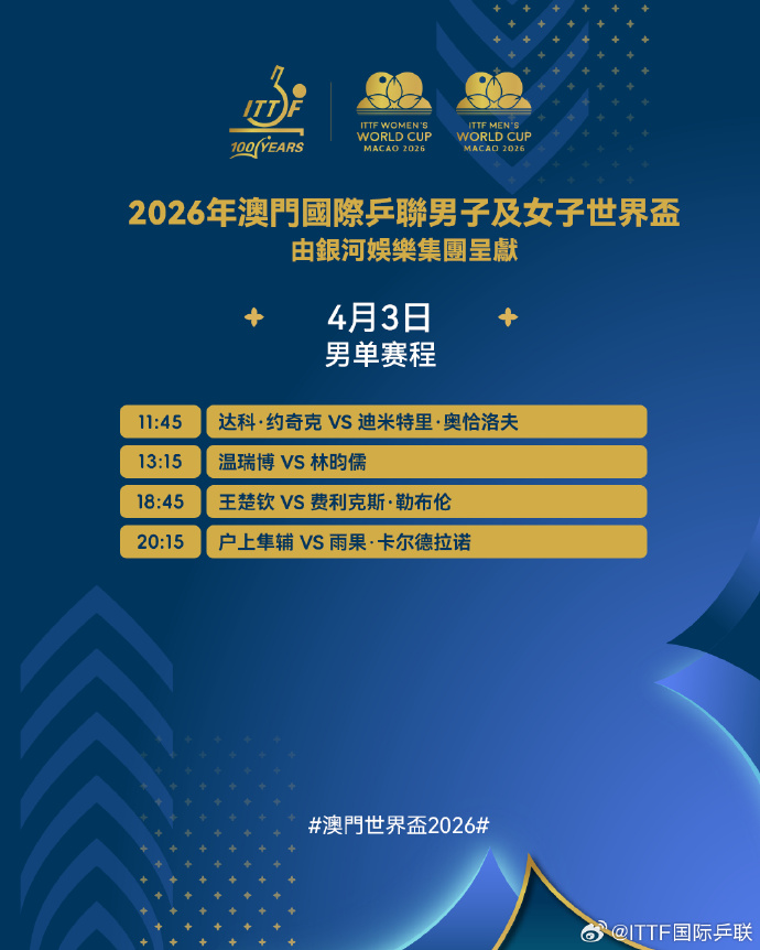 【點新聞報道】2026年澳門乒乓球世界盃進入淘汰賽階段,國家隊選手王楚欽、溫瑞博、陳幸同今日(4月3日)將在八分之一決賽中分別迎戰法國選手費利克斯·勒布倫、中國台北隊選手林昀儒以及波多黎各選手迪亞茲。