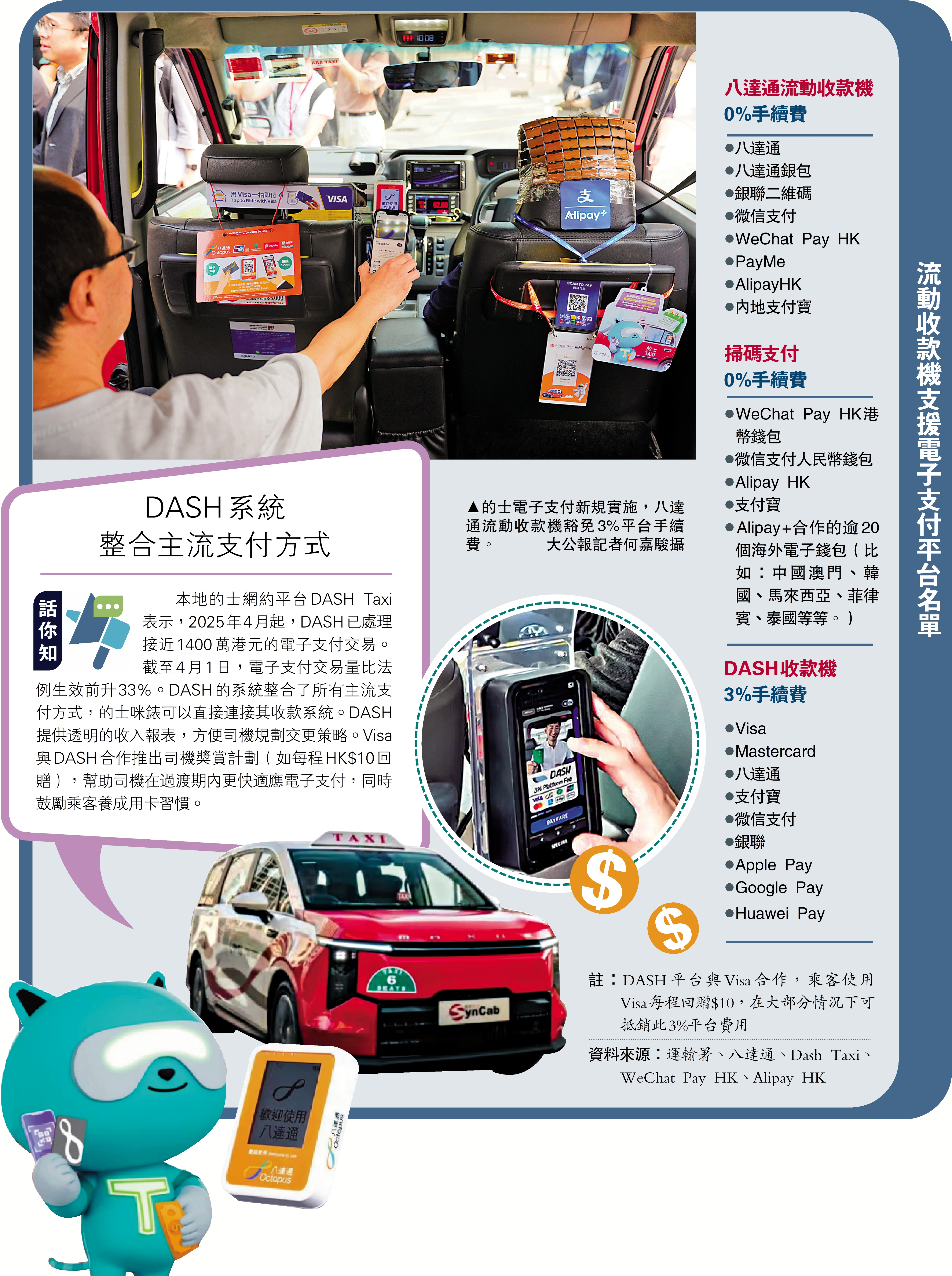 至於DASH收款機,按照DASH網頁顯示,乘客支付車資時,需支付3%的平台手續費。WeChat Pay HK表示,WeChat Pay HK港幣錢包及微信支付人民幣錢包,均免乘客手續費;Alipay HK表示,乘客毋須支付手續費。